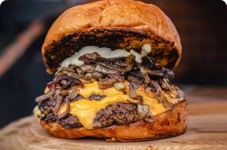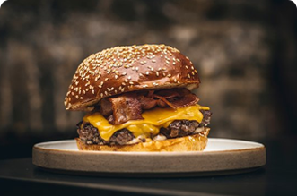 Beef patty, cheddar cheese, onion, lettuce, tomatoes, pickles